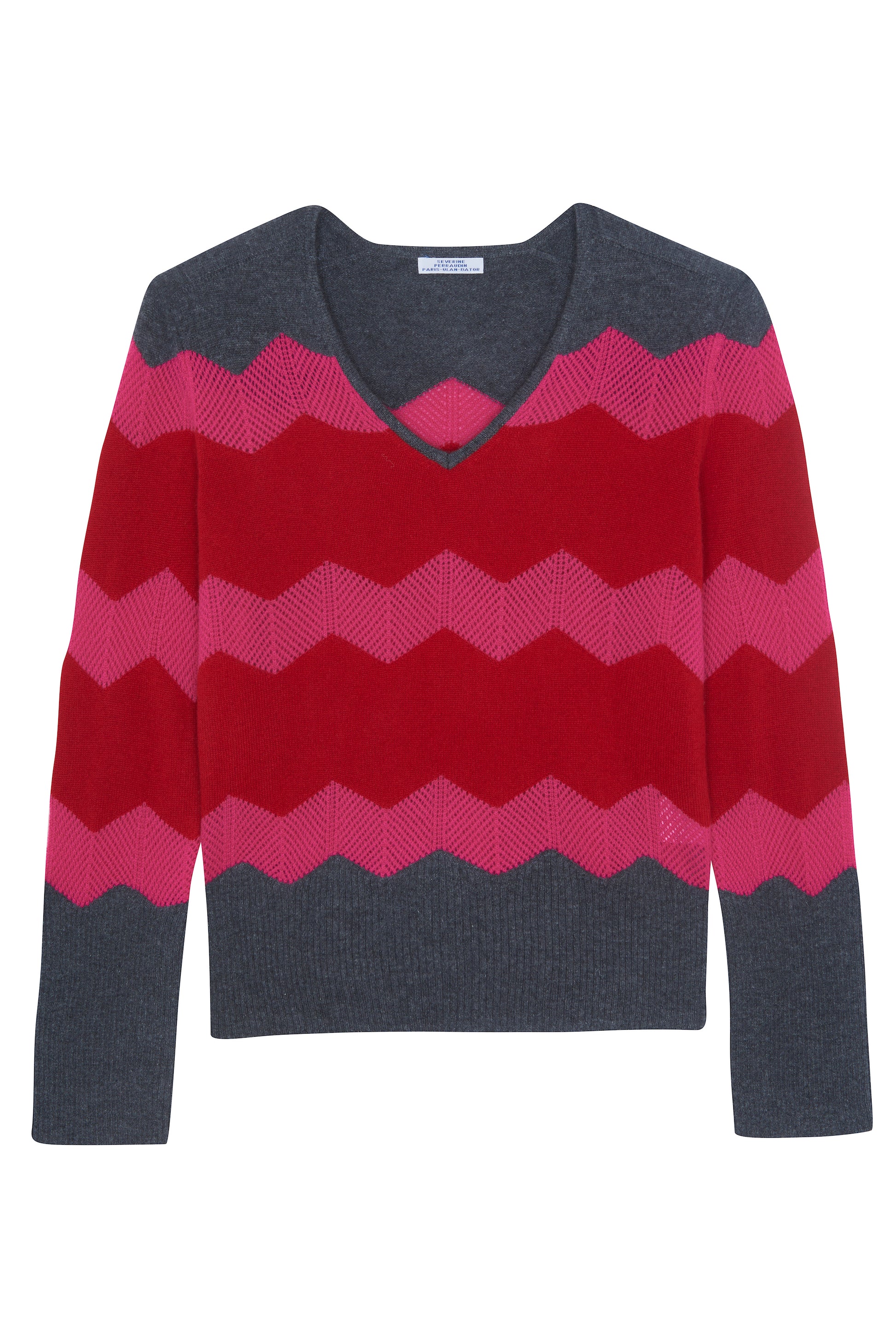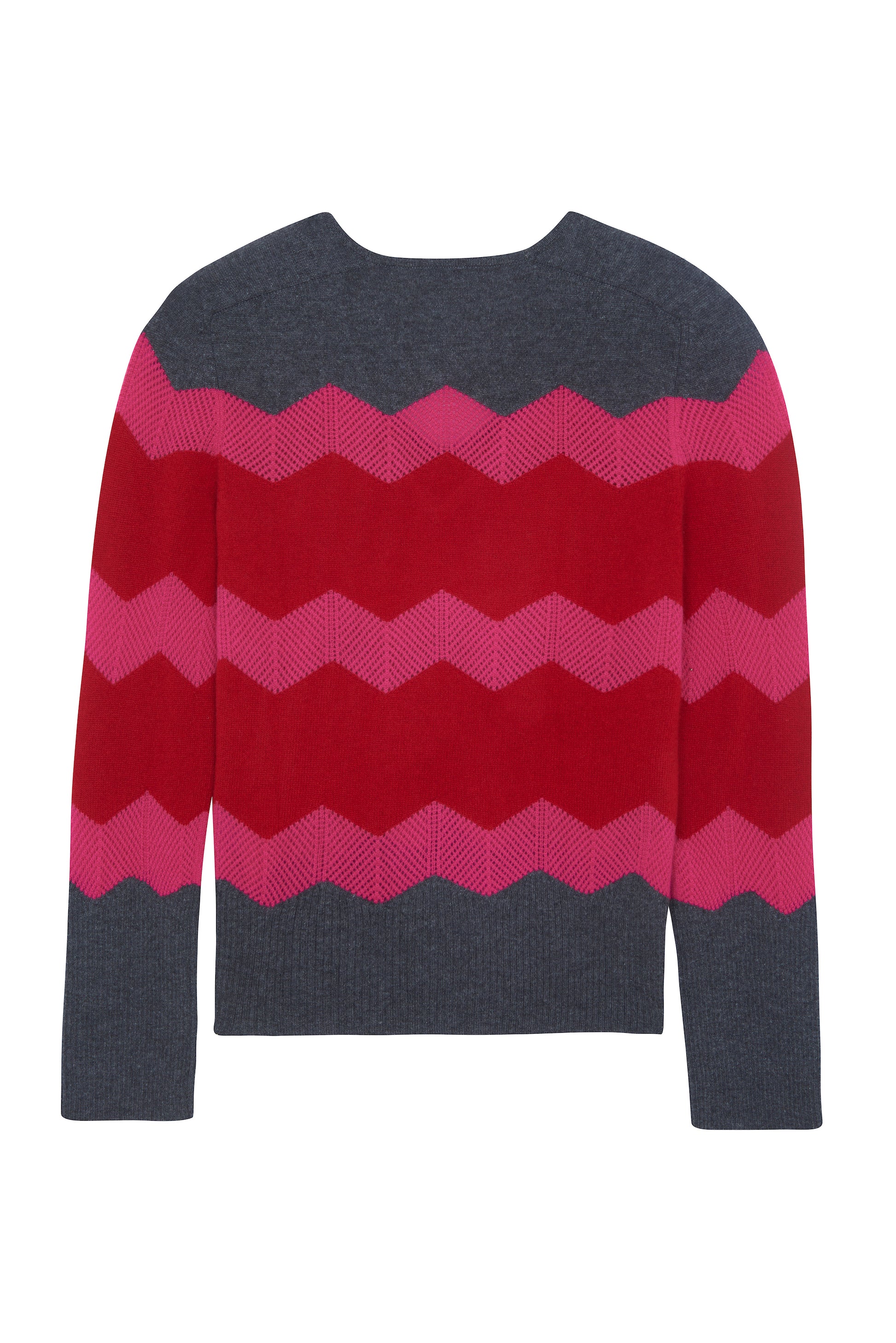 Sweater in 100% cashmere, crafted in zigzag stitch over a jersey base. The bold rhythm of contrasting grey, red, and fuchsia stripes structures and refines the silhouette with elegance, offering a sophisticated statement in a relaxed fit.