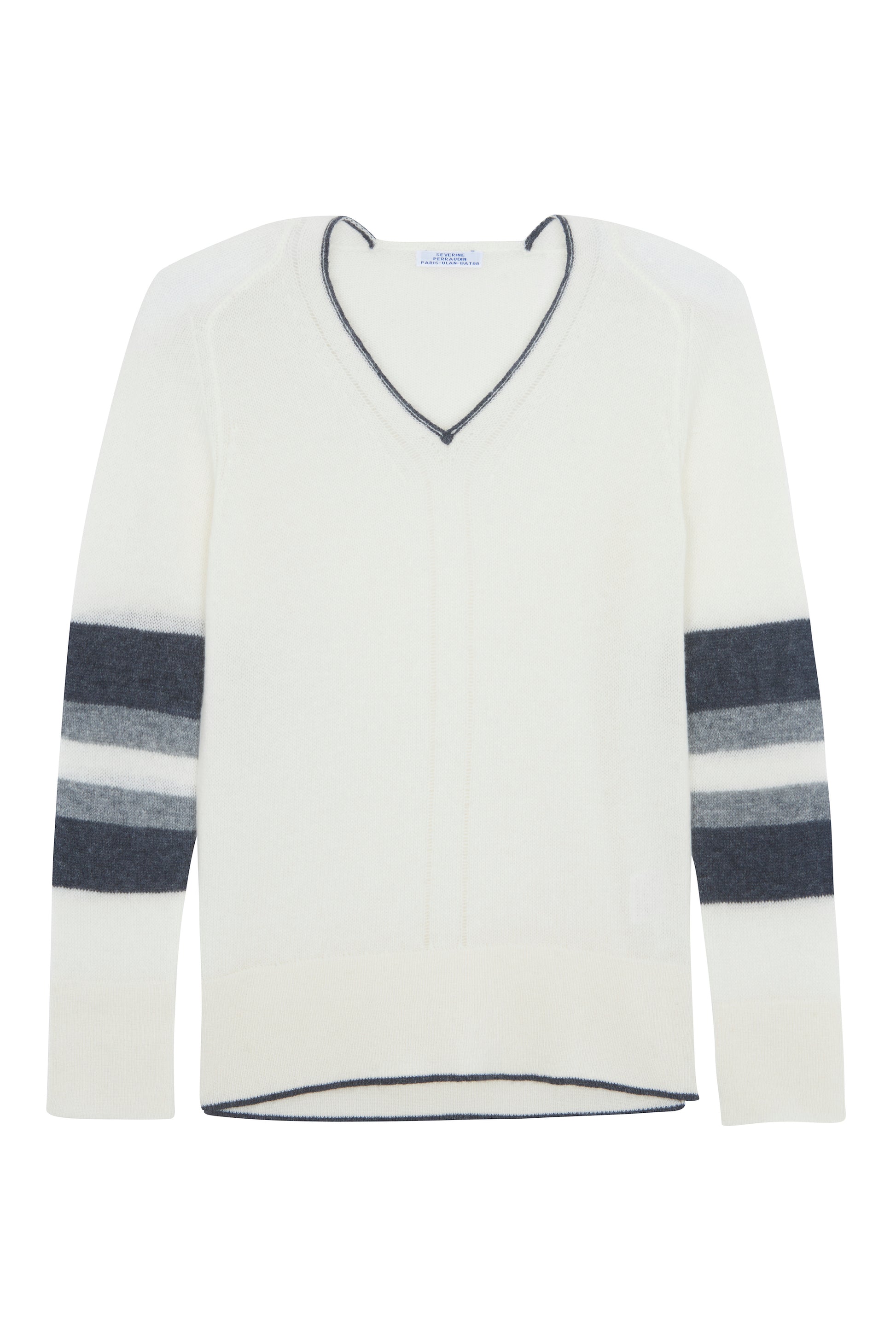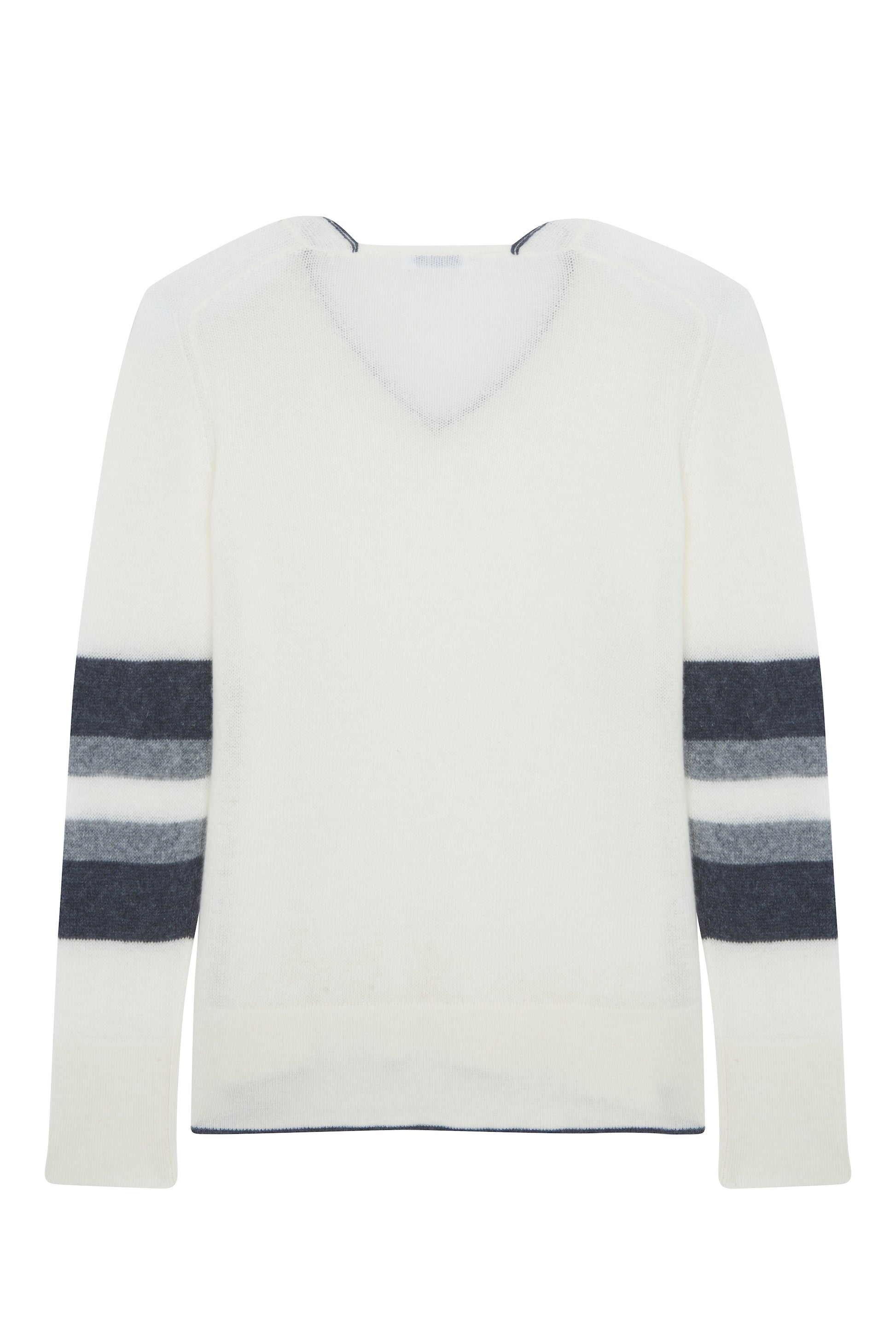 Sweater in 100% cashmere, knitted in lightweight single-thread jersey. Its relaxed, comfortable volume and contrasting striped sleeves create a refined yet effortless aesthetic, perfect for timeless elegance in everyday wear. Colors: white and grey.