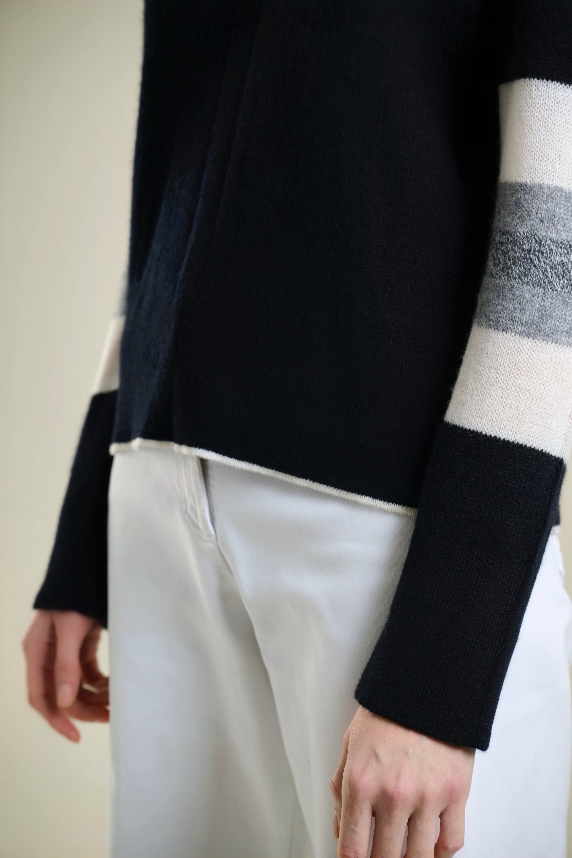Sweater in 100% cashmere, knitted in lightweight single-thread jersey. Its relaxed, comfortable silhouette and subtly contrasting striped sleeves in black, white, and grey convey effortless refinement, creating a piece that is both casual and elegant.