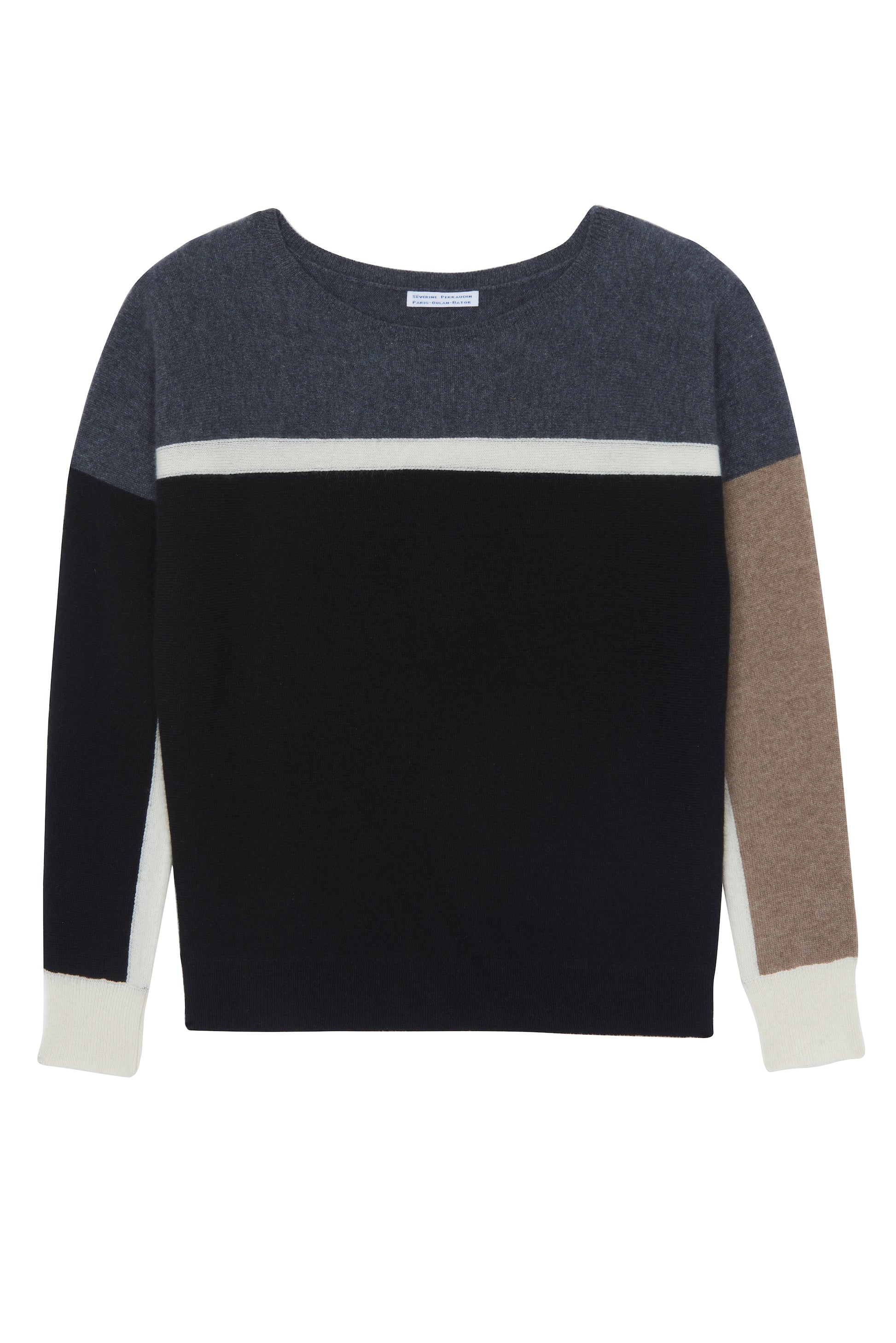 Sweater in 100% cashmere, knitted in horizontal jersey for a durable and soft touch. The boat neck and relaxed silhouette are enhanced by an elegant three-color intarsia pattern in neutral, black, middle brown, and anthracite, creating a balanced graphic effect. Lightweight, soft, and fluid, this sweater drapes beautifully on the skin, combining timeless elegance with modern graphic sophistication.