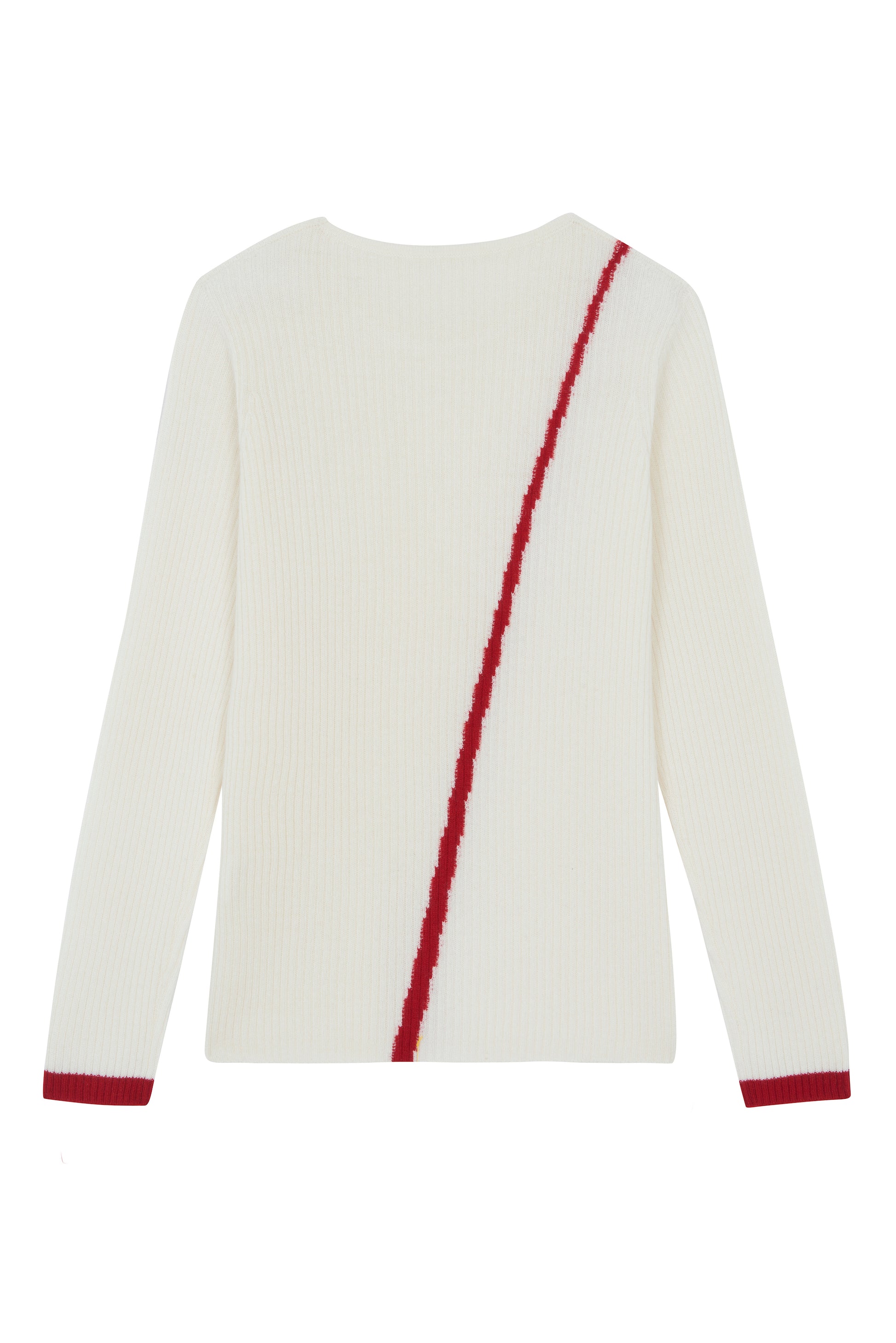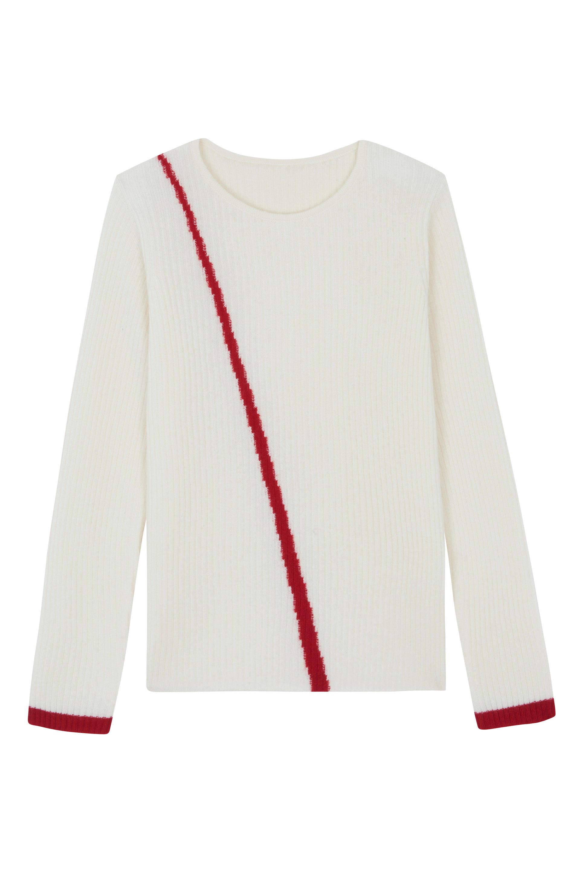 Sweater in 100% cashmere, knitted in soft rib for a fluid and comfortable fit. Its fitted silhouette is enhanced by a bold asymmetric block color pattern in white and red, highlighted by a sharp diagonal that structures the form. The wide neckline emphasizes the collarbone, while the lightweight two-ply construction ensures natural movement and effortless elegance.