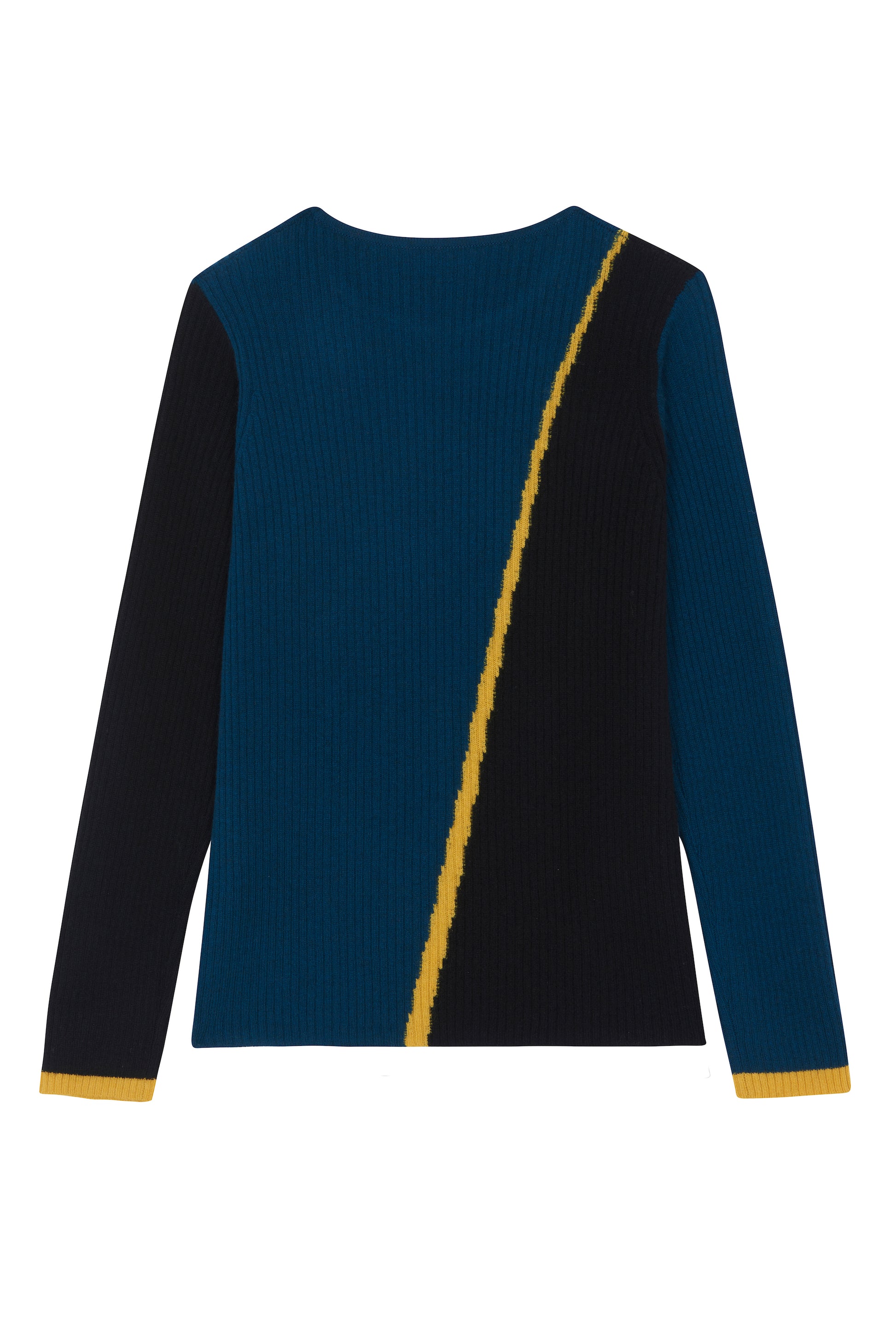 Sweater in 100% cashmere, knitted in soft rib for a fluid and comfortable fit. Its wide neckline and fitted silhouette are elevated by an asymmetric block color pattern in deep blue, black, and sunray, accented with precise contrasting cuffs. The sharp diagonal structure and lightweight two-ply construction allow natural movement, balancing modernity and elegance in every detail.
