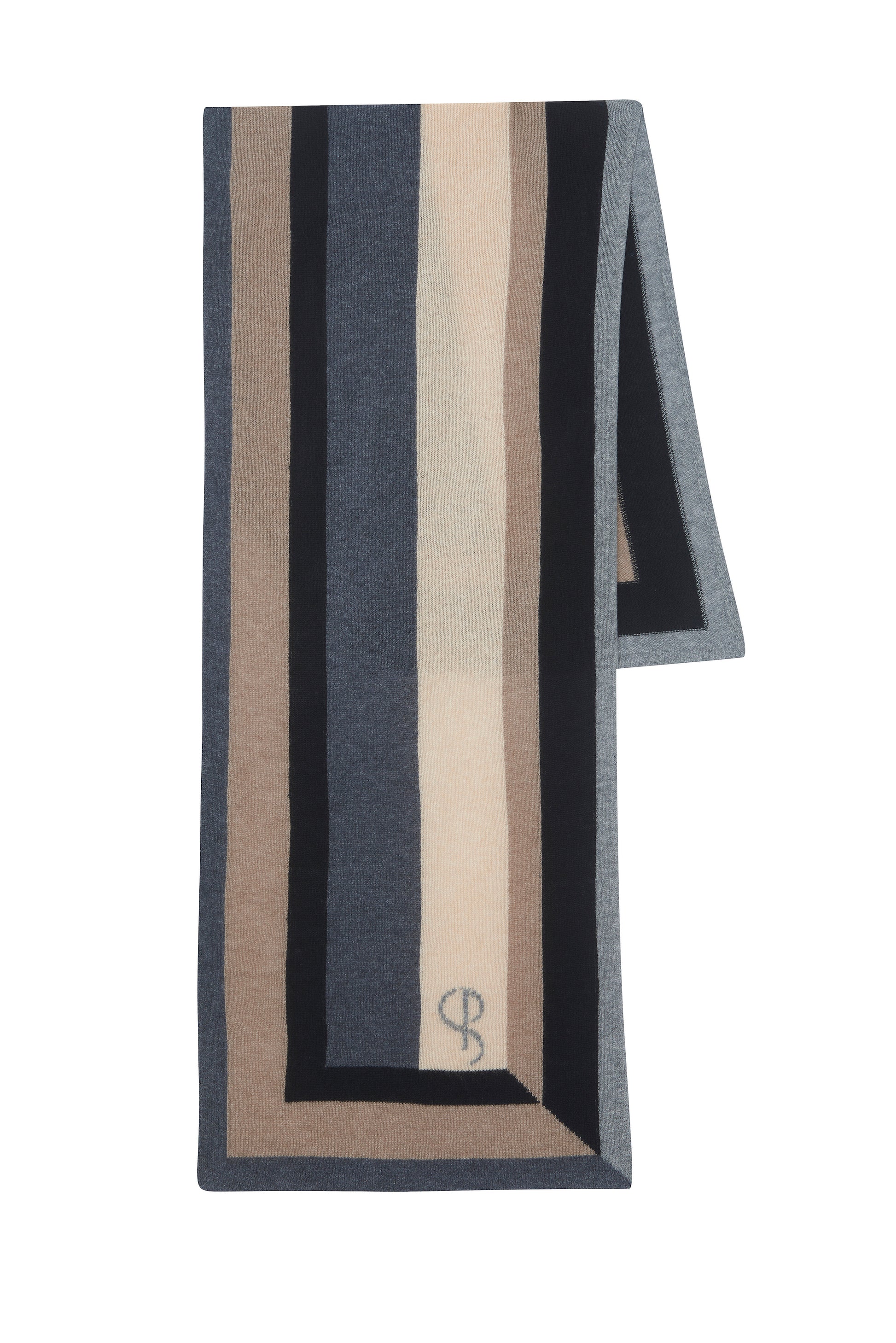 Scarf in 100% cashmere, 175 × 48 cm, knitted in jersey. Contrasting stripes in light gray, black, ecru, medium brown, and ash gray create a sober and graphic aesthetic, beautifully revealed when the scarf is elegantly tied.