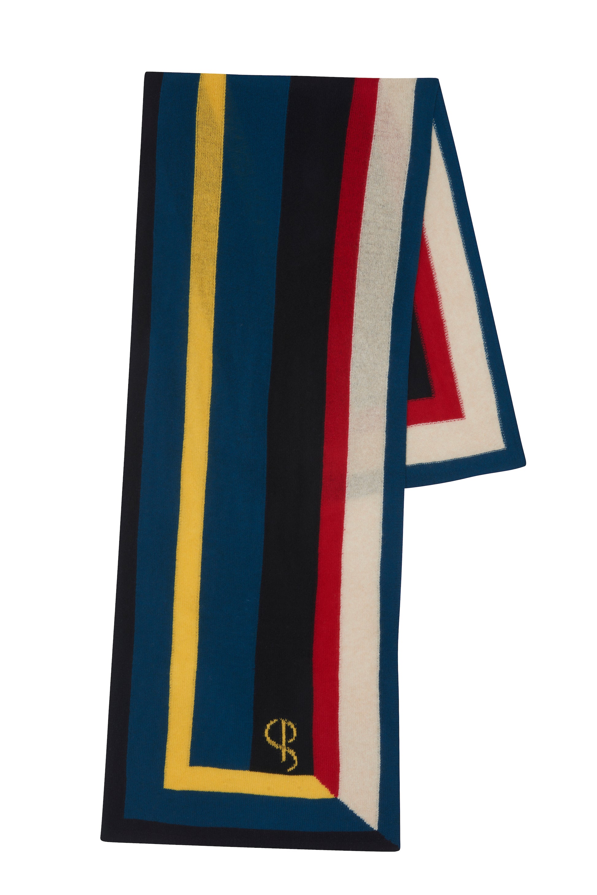 Scarf in 100% cashmere, featuring a graphic motif in a Constructivist-inspired design. The palette of black, blue, red, and yellow draws inspiration from modernist design and strong Constructivist contrasts, creating a bold, urban statement.